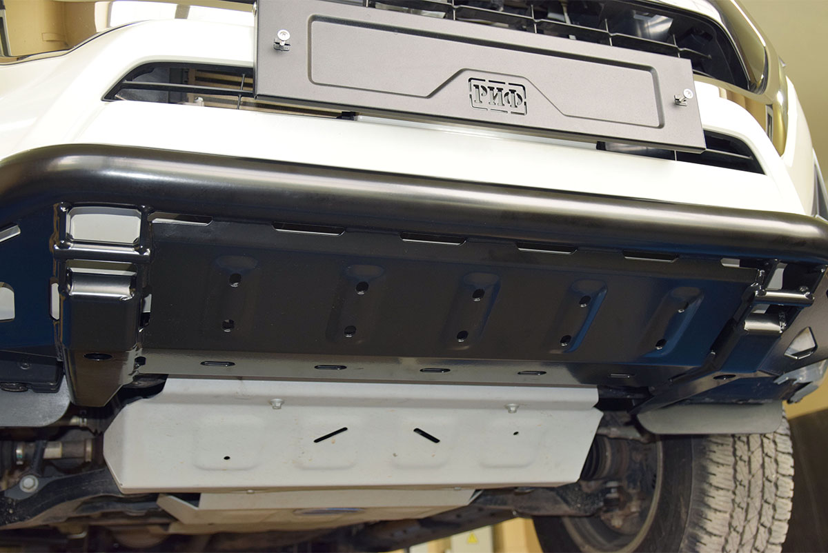 Новый передний бампер РИФ для Toyota Hilux 2020 – это не просто защита штатного бампера, а уникальная силовая конструкция, являющаяся одновременно и полноценным силовым бампером с интегрированной защитой радиатора! Защита радиатора тяг выполняет важную роль в усилении конструкции, поэтому она и является частью бампера.