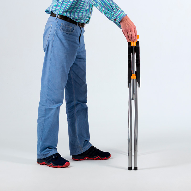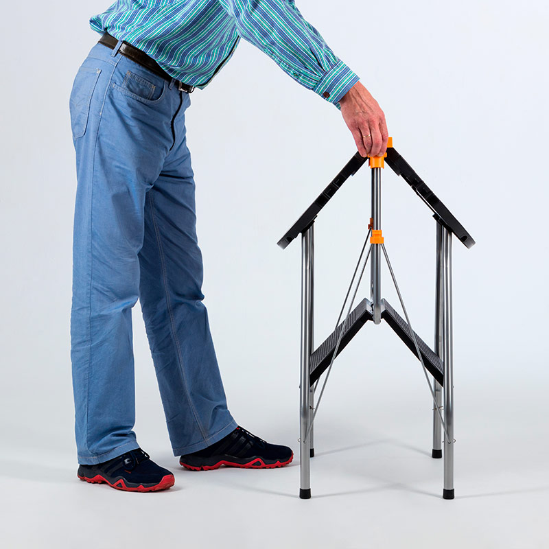Имеет удобный механизм складывания: одно нажатие на стопорные кнопки по бокам столешницы и стол мгновенно складывается в плоский формат размером всего 65х90х8 см с удобной встроенной ручкой для переноски (см. инструкцию «сложить-разложить»).